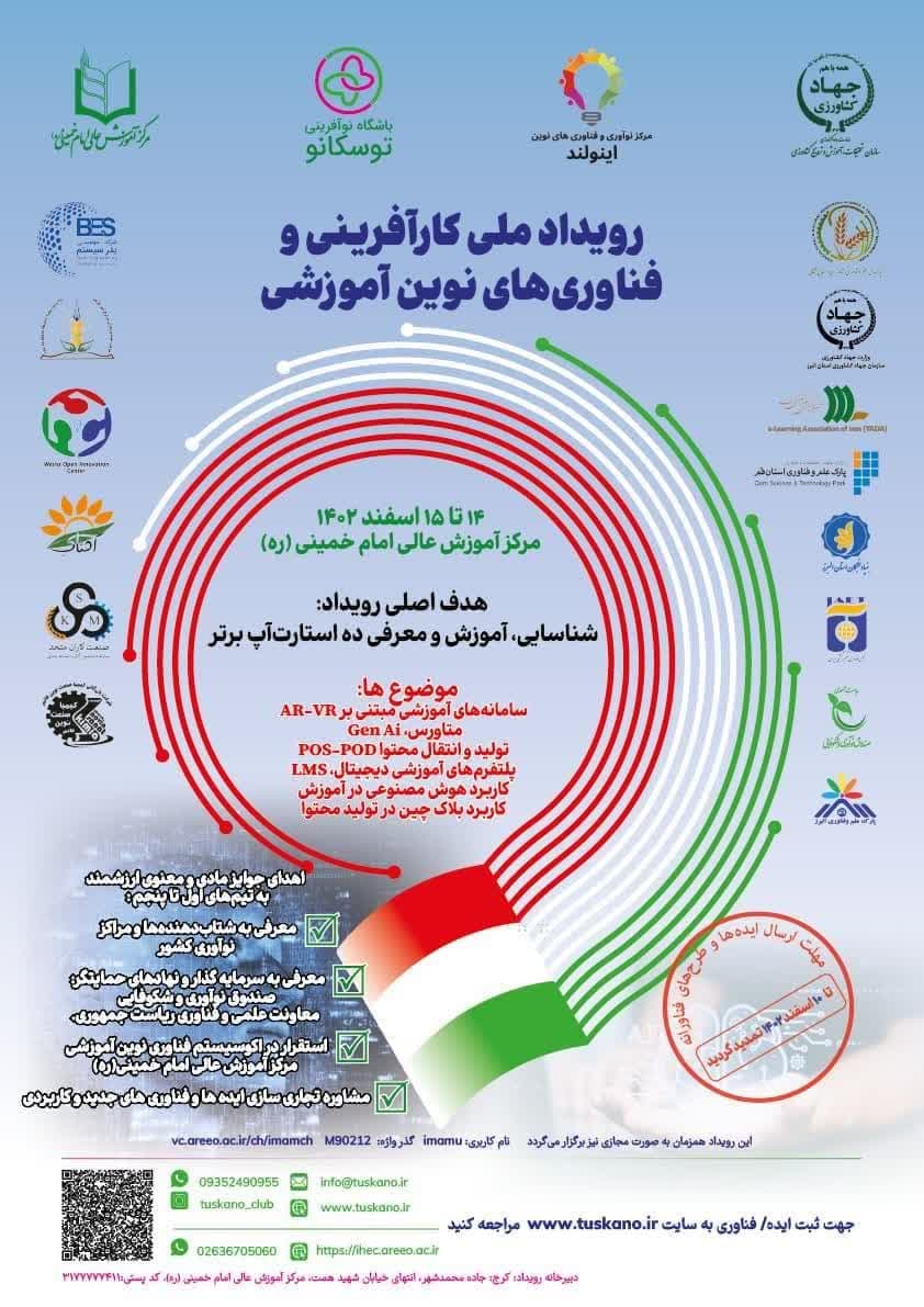 به استحضار میرساند با توجه به تغییرات پیش آمده، زمان برگزاری رویداد ملی کارآفرینی و فناوریهای نوین آموزشی به تاریخ ۱۴ الی ۱۵ اسفند ماه ۱۴۰۲ تغییر یافته است. برای ثبت و ارائه ایدهها و فناوریهای پیشنهادی در سایت رویداد https://tuskano.ir تا تاریخ ۱۰ اسفند مراجعه نمایید.