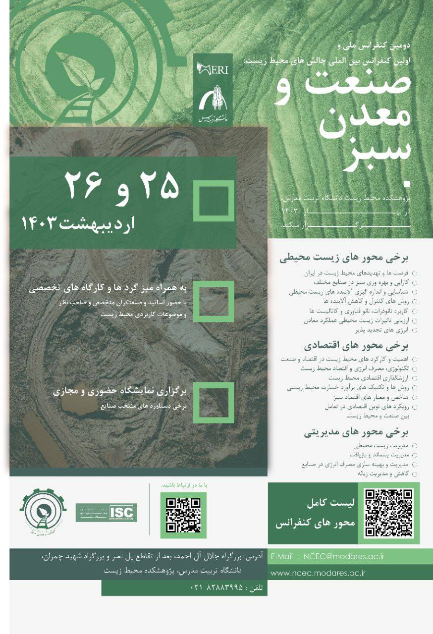 به اطلاع می‌رساند در راستای ایجاد بستری مناسب برای تبادل نظر و ارتقا سطح دانش به منظور ارائه راهکارهای مناسب برای پیشگیری از وقوع بحران‌های محیط زیستی و ترغیب به استفاده از فناوری‌های سبز،‌ دومین کنفرانس ملی و اولین کنفرانس بین‌المللی چالش‌های محیط زیست: صنعت و معدن سبز، طی روزهای سه‌شنبه و چهارشنبه مورخ 25 و 26 اردیبهشت ماه 1403 در دانشگاه تربیت مدرس برگزار می‌شود. اطلاعات تکمیلی در وب سایت کنفرانس به نشانی http://ncec.modares.ac.ir قابل دریافت است.