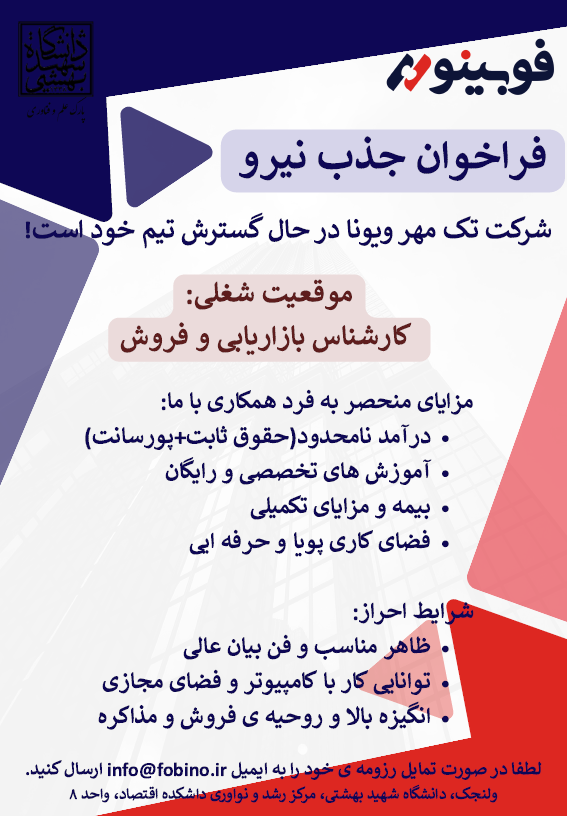 به استحضار میرساند شرکت تک مهر ویونا مستقر در پارک علم و فناوری اقدام به جذب نیرو از میان دانشجویان و فارغالتحصیلان میکند. برای اطلاعات بیشتر به پیوست مراجعه شود.