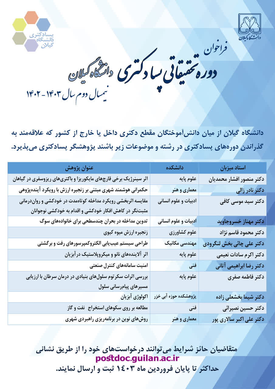 دانشگاه گیلان در راستای استفاده از ظرفیتهای نخبگی و فارغالتحصیلان جوان، از میان دانشآموختگان مقطع دکتری تخصصی داخل یا خارج از کشور و علاقمند به گذراندن دوره تحقیقاتی پسادکتری، در نیمسال دوم سال تحصیلی 1402-1403 پژوهشگر میپذیرد. متقاضیان حائز شرایط میتوانند درخواستهای خود را از طریق نشانی postdoc.guilan.ac.ir حداکثر تا پایان فروردینماه 1403 ثبت و ارسال نمایند.