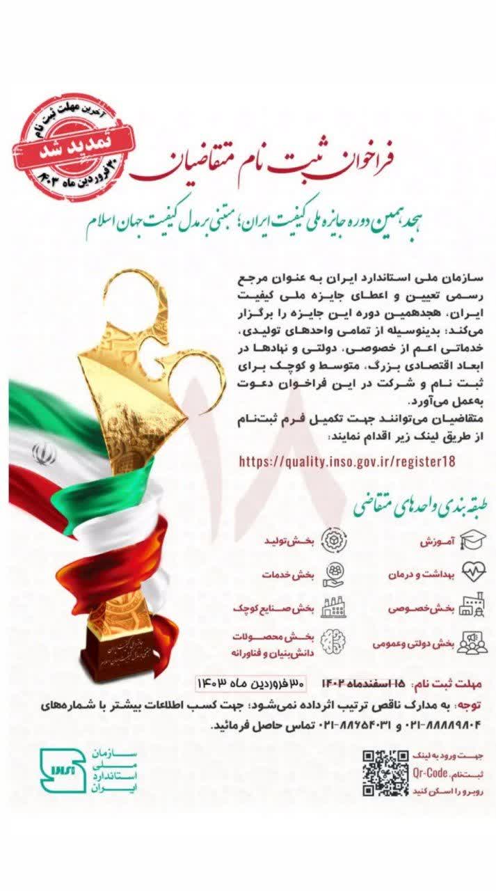 به اطلاع می‌رساند سازمان ملی استاندارد ایران به عنوان مرجع رسمی تعیین و اعطای جایزه ملی کیفیت ایران و پژوهشگاه استاندارد به عنوان مجری انحصاری جایزه ملی کیفیت ایران،‌اقدام به برگزاری هجدهمین دوره جایزه ملی کیفیت ایران مبتنی بر مدل کیفیت جهان اسلام نموده‌اند.