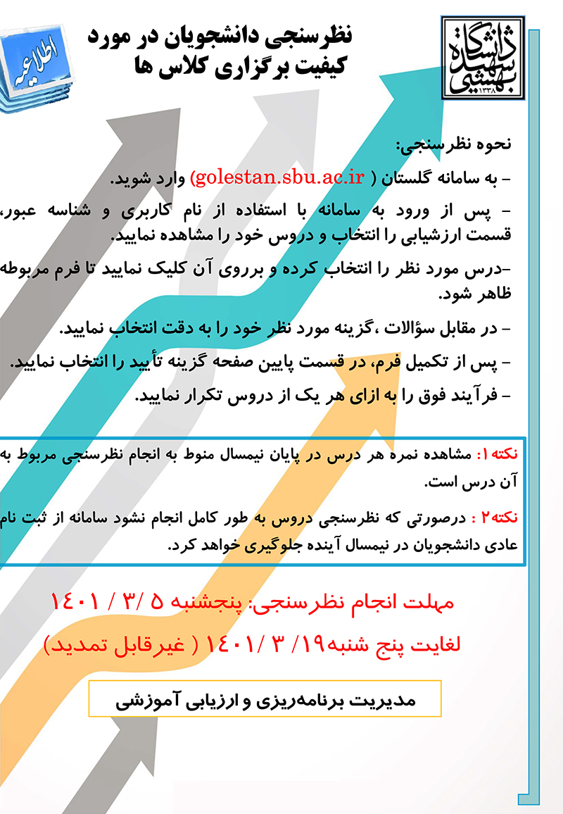 دانشجویان عزیز با مراجعه به سامانه گلستان از روز پنجشنبه 5 تا 19 خرداد 1401 می‌توانند در این نظرسنجی شرکت کنند.​​​​​​​