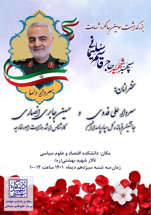 مراسم بزرگداشت سومین سالگرد شهادت سپهبد حاج قاسم سلیمانی برگزار می شود 2244 بازدید print share مراسم بزرگداشت سومین سالگرد شهادت سپهبد حاج قاسم سلیمانی؛ سه شنبه 13 دی ماه، 1401 برگزار میشود. این...